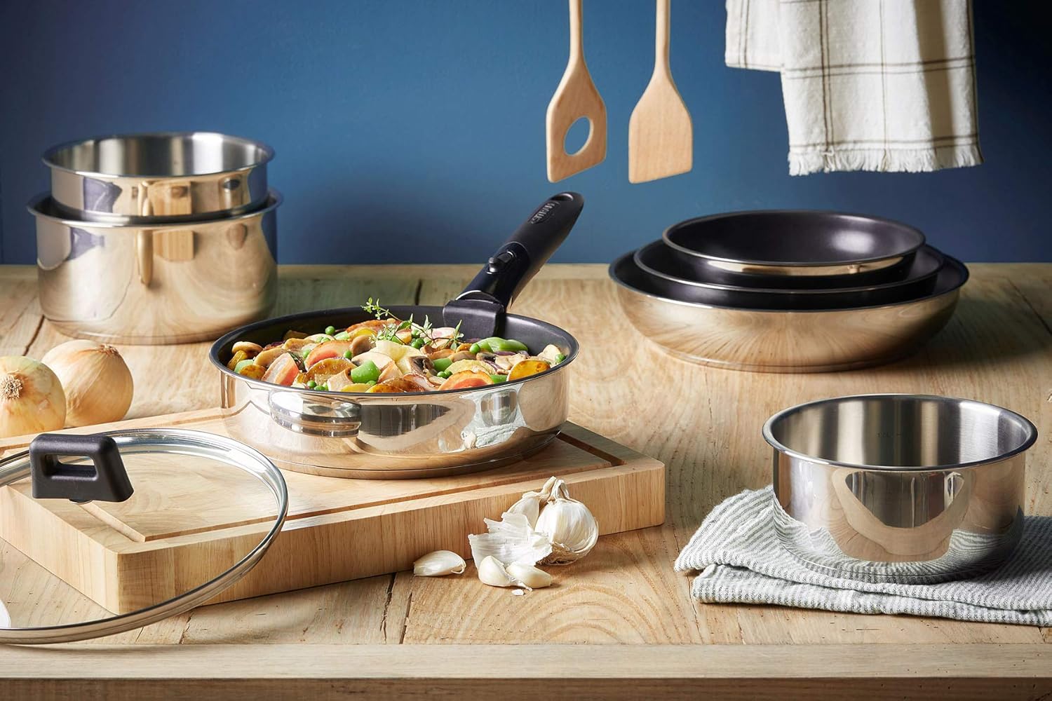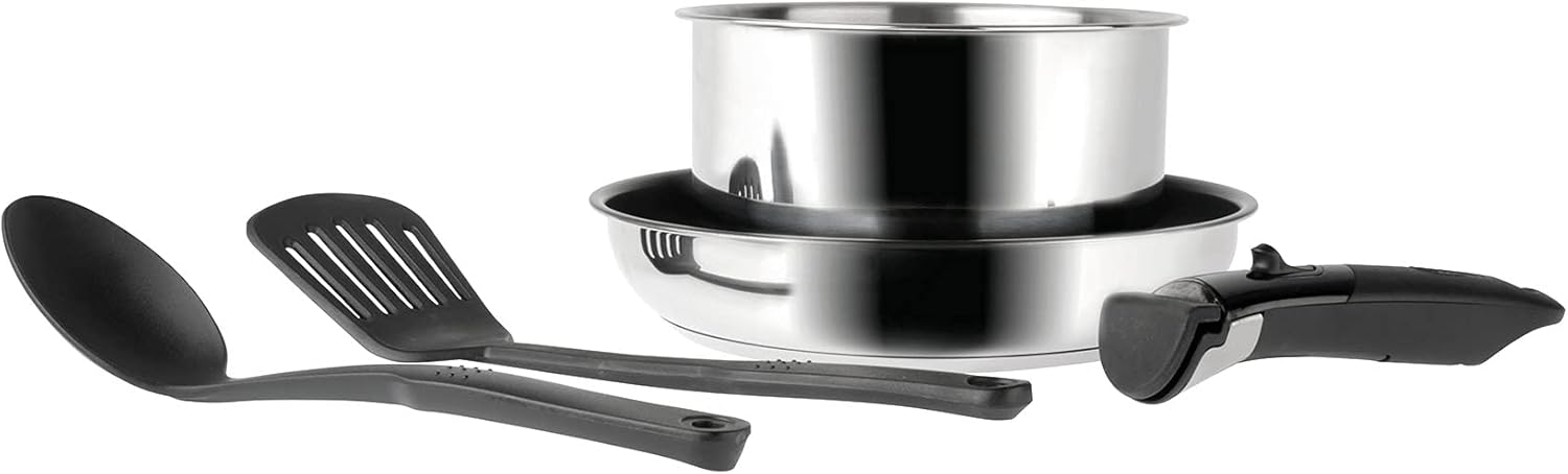 Batterie 5 pièces Inox – Gamme ARPEGE – 1 Casserole ø18 cm Inox avec graduation litrage, 1 Poêle ø24 cm avec revêtement anti adhérent + 1 Spatule en Nylon, 1 Cuillère en Nylon, 1 poignée Sitramovible – Tous feux DONT induction