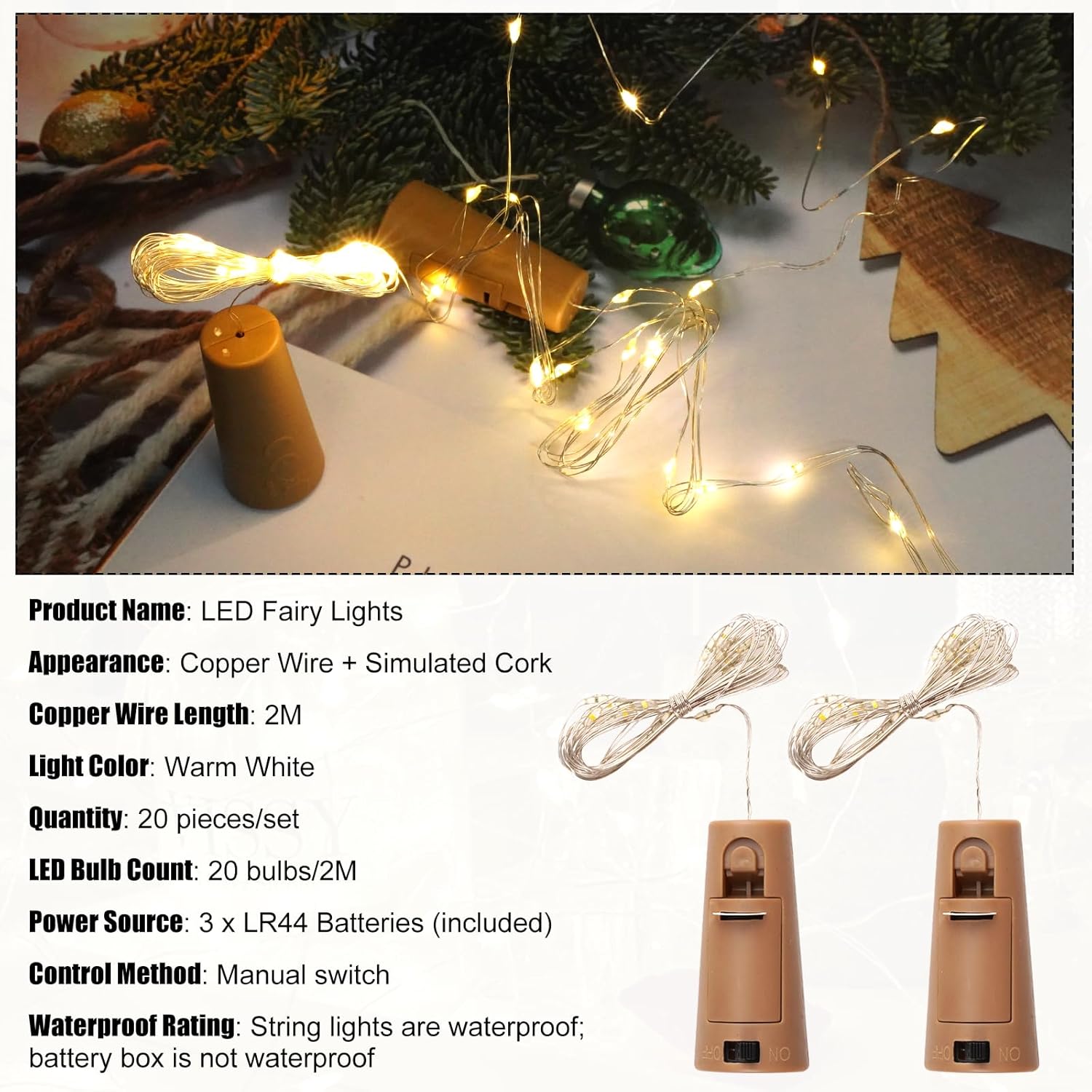 Chaque lumière de bouteille avec liège est alimentée par 3 piles boutons LR44 (incluses), ce qui en fait le choix idéal pour les fêtes de fin d’année, les mariages, les dîners d’anniversaire et les décorations d’intérieur.
