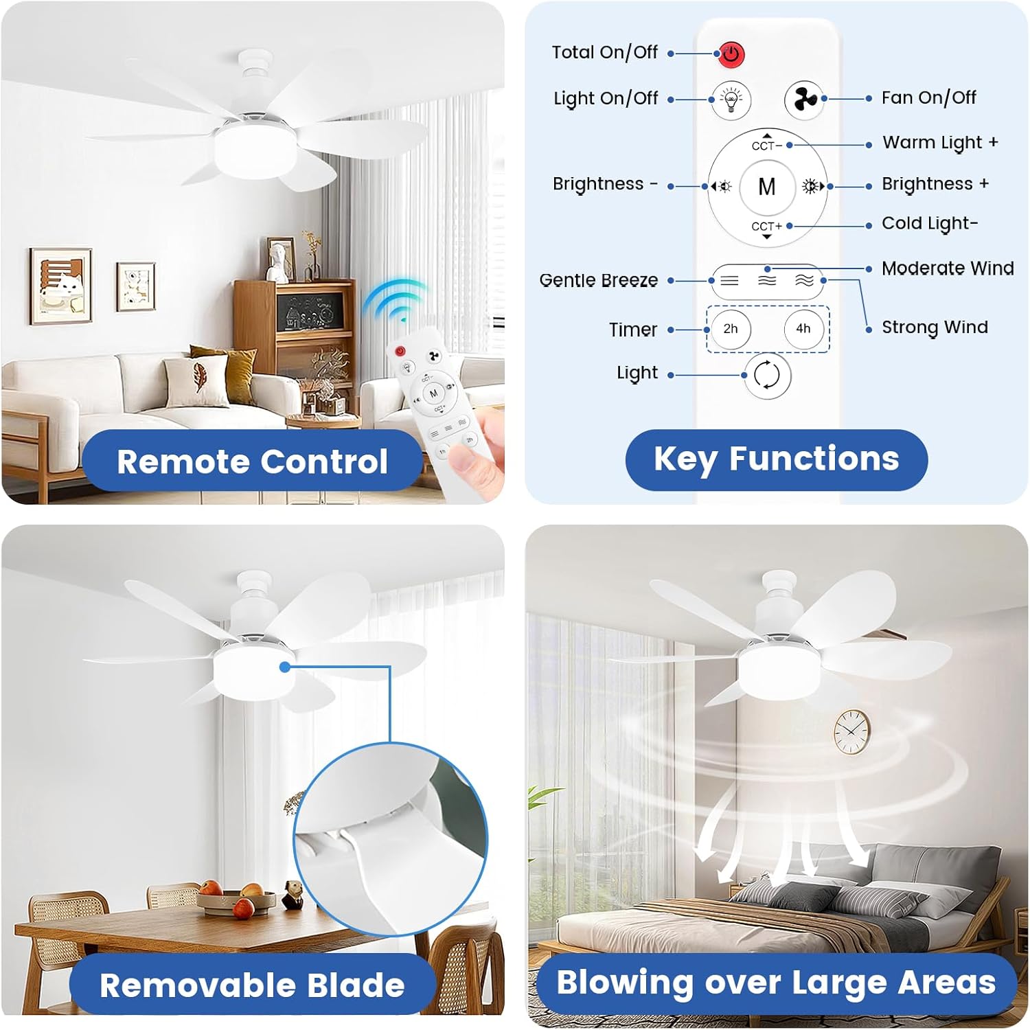 【Télécommande intelligente】 : ce ventilateur de plafond avec lumière peut facilement régler la luminosité, la vitesse du ventilateur et le mode d’éclairage à l’aide de la télécommande intelligente. Même après l’arrêt du ventilateur, tous les paramètres sont mémorisés et la dernière température et luminosité utilisées seront restaurées lors de sa remise en marche.