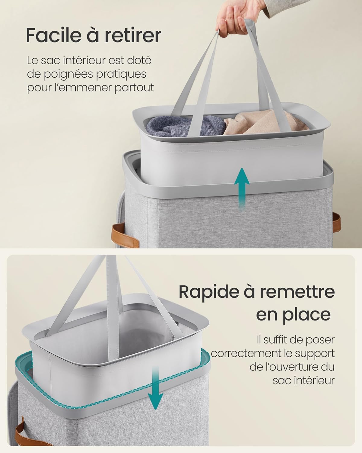 【FACILE À DÉPLACER ET À VIDER】Le corps du panier et les sacs internes sont dotés de poignées pour transporter le linge vers la machine à laver même si vous devez monter et descendre des escaliers. Au fond du sac, une poignée permet de le vider aisément