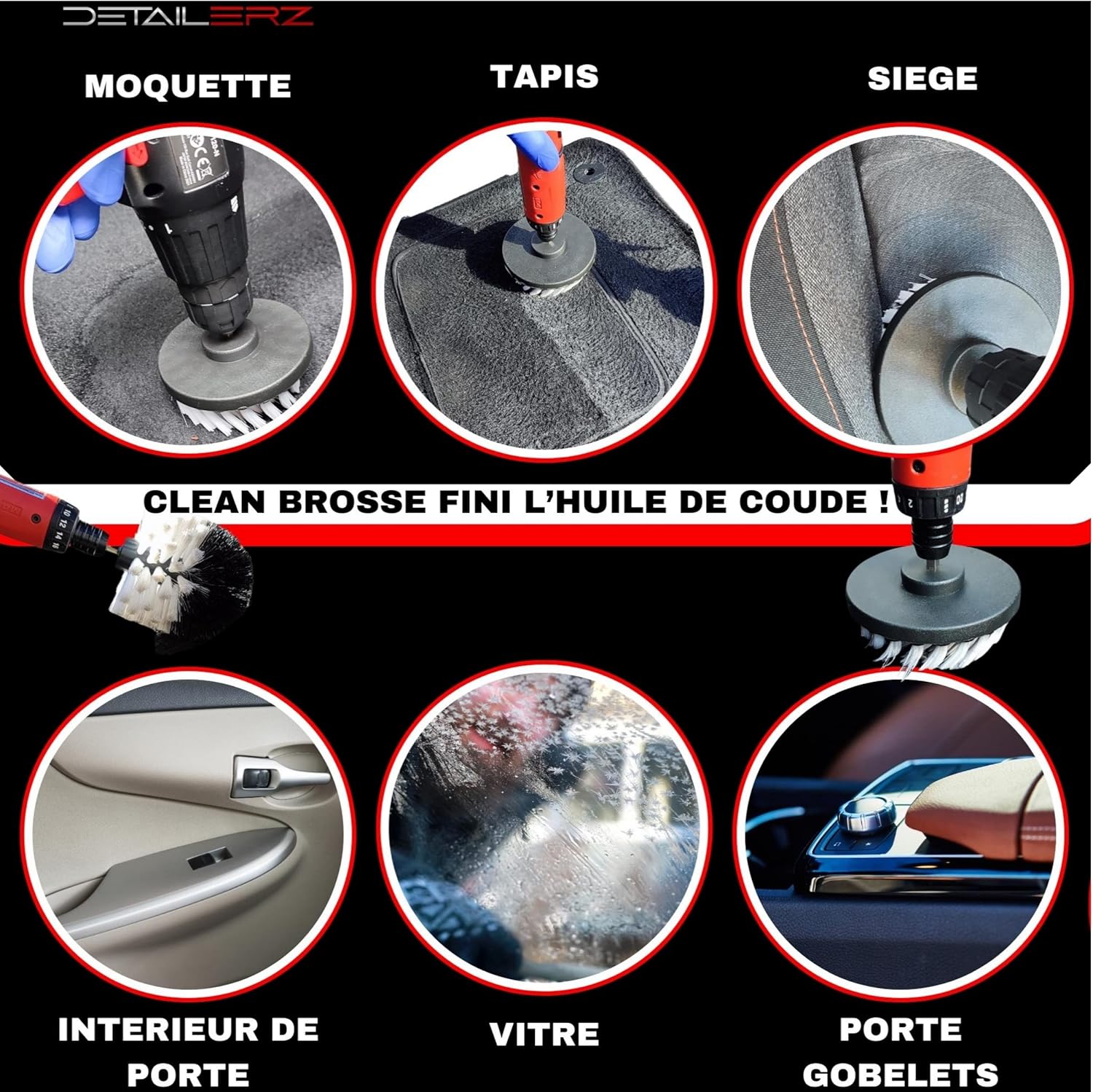 Imaginez une brosse pour visseuse qui vous permette de nettoyer en profondeur tous vos tissus, cuir, vinyl, plastique, sans effort ? Plus besoin de frotter grâce à la brosse rotative nettoyage voiture pour un résultat professionnel. Il suffit d’adapter les CLEAN BROSSE de marque DETAILERZ à votre perceuse ou visseuse sans fil. Nos brosses blanches à poils souples ne provoquent pas de bouloche sur le tissu et permettent un nettoyage de qualité