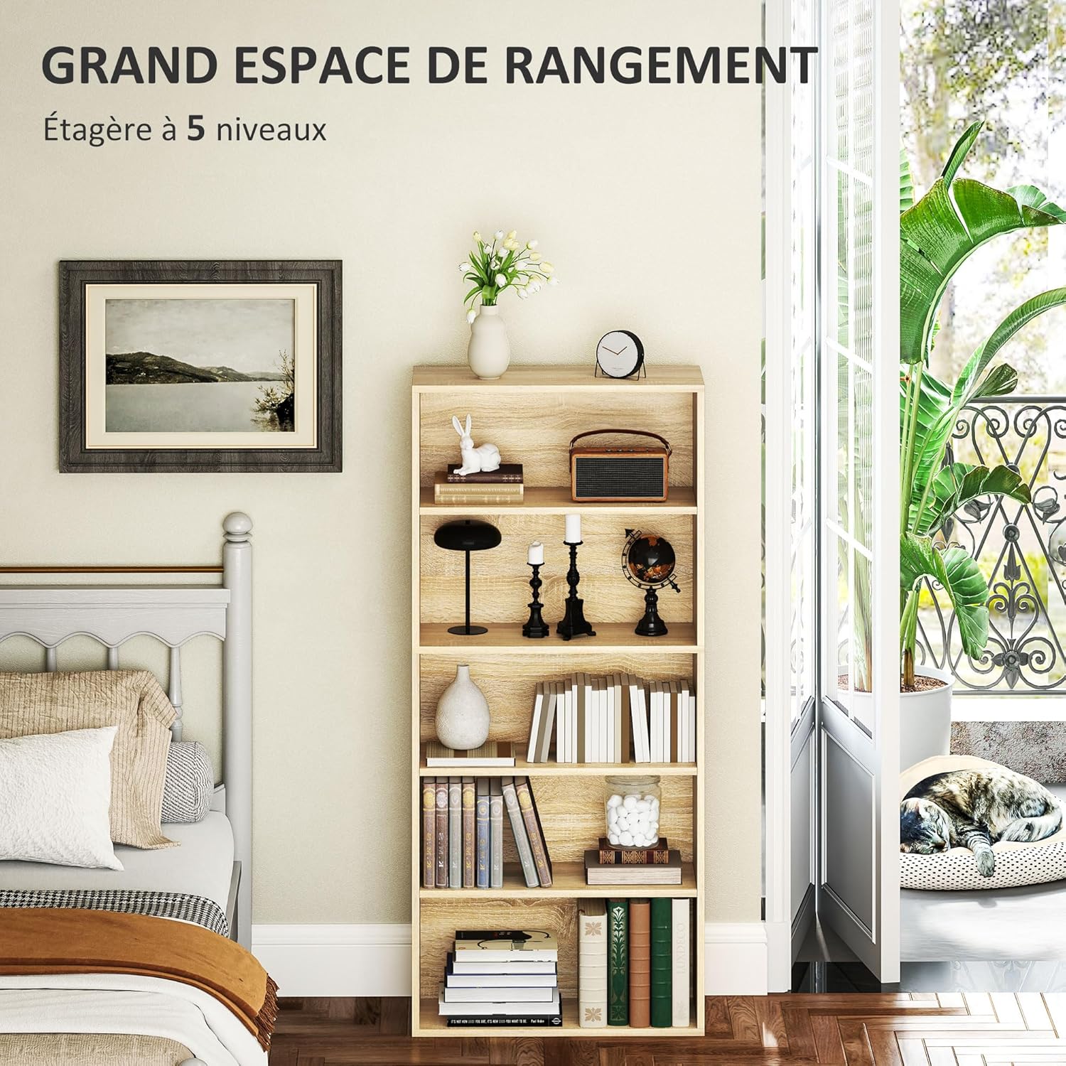 Étagère de salon avec cinq compartiments ouverts organisent livres et objets décoratifs Les étagères ajustables de la bibliothèque offrent des options de rangement flexibles La sangle anti-basculement améliore la sécurité et la stabilité La surface en mélamine garantit un nettoyage facile L’étagère de rangement polyvalente convient aux salons ou aux chambres à coucher Montage nécessaire