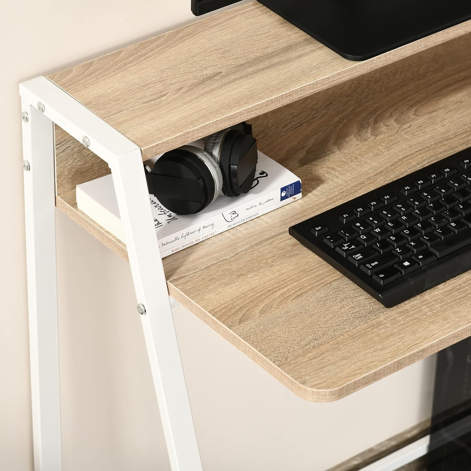 Couleur marron Matériaux principaux panneaux MDF et métal Dimensions totales L 84 x l 45 x H 85 cm Hauteur plateau de travail 72 cm Dimensions étagère supérieure L 78x l 10 cm Charge maximale recommandée 20 Kg Réf. 836-055AK Contenu du colis Livraison effectuée en un colis Note Si vous souhaitez la reprise de votre ancien produit, merci de consulter nos CGV sur les modalités de reprise et de nous contacter via la messagerie.