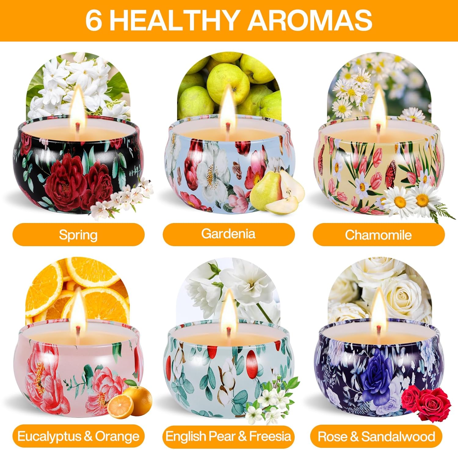 SIX Parfums : Découvrez notre collection exclusive coffret bougies parfumées cadeau : » Rose & Santal » pour des soirées romantiques, « Printemps « pour la fraîcheur du printemps, « Eucalyptus & Orange « pour la tonicité, » Poire anglaise & Freesia » » Rafraîchissante « , » Camomille »» apaisant, et « Gardénia » avec son riche parfum floral.