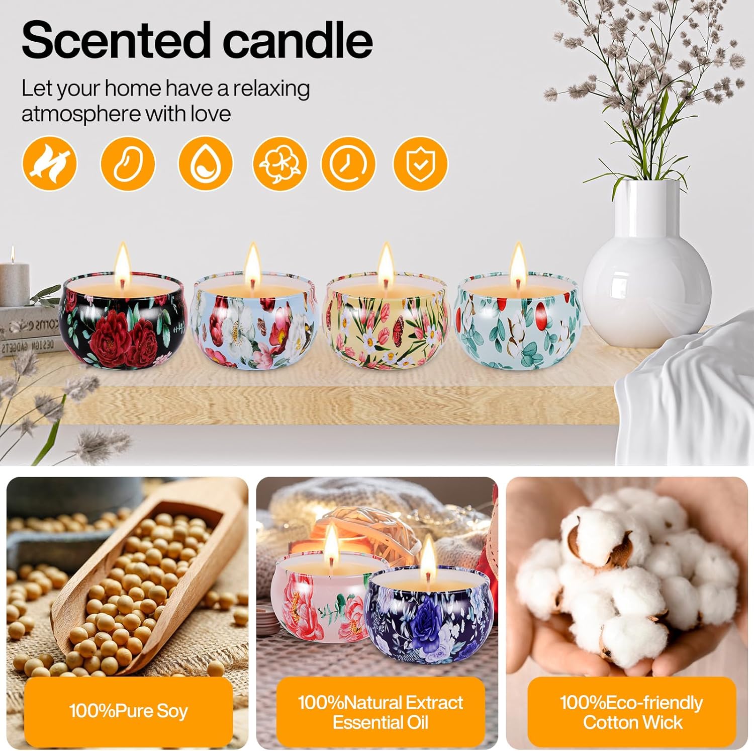-Cire de soja naturelle, les bougies parfumée sont faites de cire de soja naturelle et de mèche en coton sans plomb, ne contiennent aucun additif chimique ni colorant, brûlent uniformément et ne produisent pas de fumée noire. Plus propre et plus sain.
