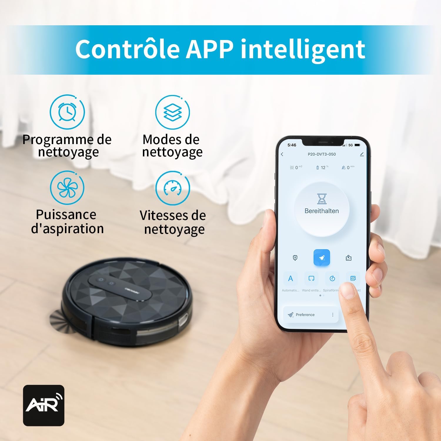 Contrôle intelligent via l’application avec son application Airrobo, le contrôle du robot aspirateur est facile et intuitif. Vous pouvez facilement régler des programmes de nettoyage, changer les modes de nettoyage, régler le niveau d’aspiration et la direction de nettoyage. Le robot aspirateur est également équipé d’une télécommande séparée, qui permet l’utilisation sans connexion réseau. Autonomie de la batterie de 120 minutes et charge automatique.