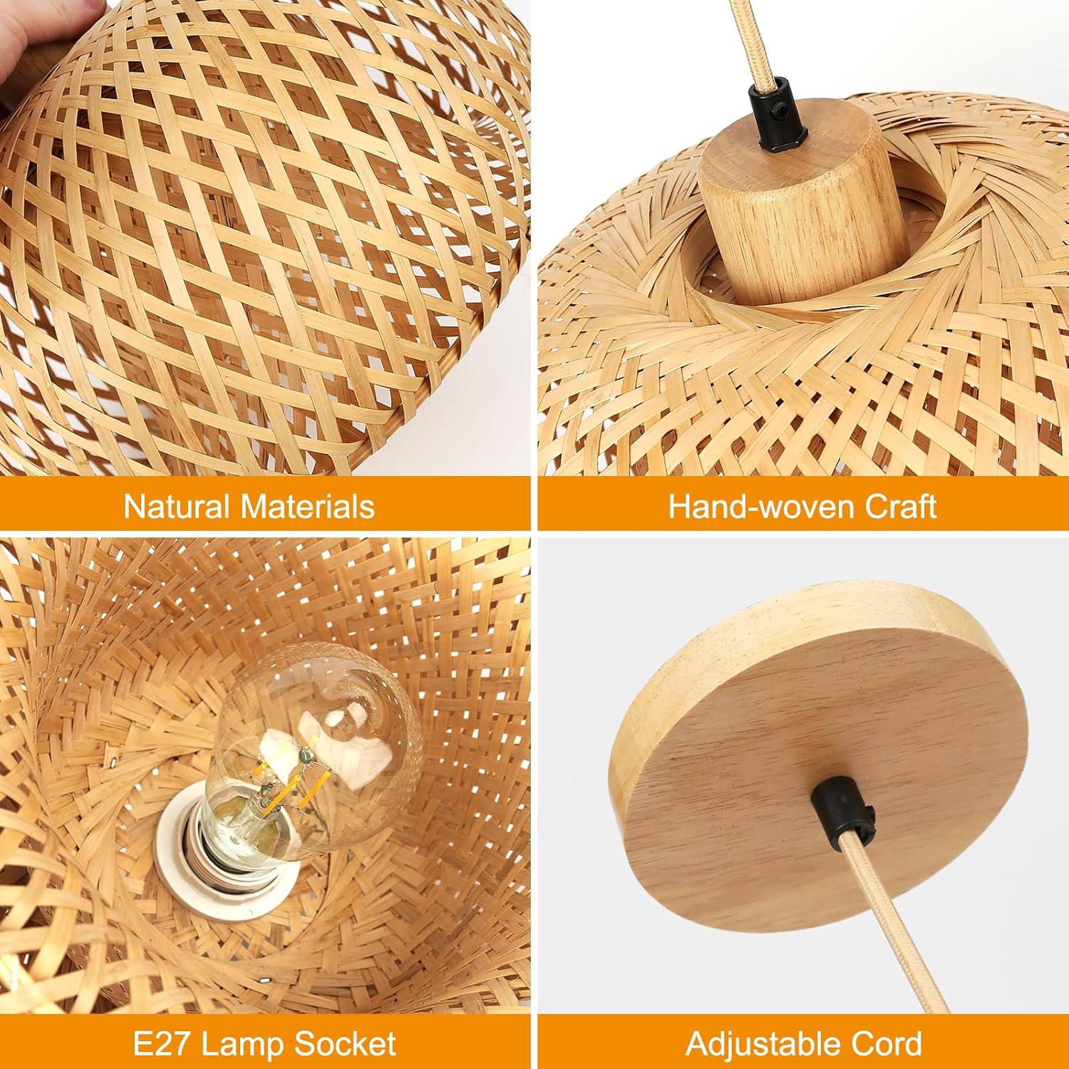 Sie können die Länge des Lichtkabels einfach an Ihre Raumbeleuchtung anpassen, sodass diese Bambus-Hängeleuchte als Hängelampe oder Deckenleuchte verwendet werden kann. Lorsqu’il est éclairé, l’abat-jour émet une belle lumière jaune chaude et a la forme d’une projection superposée, ce qui est rêveur et unique. Décoration parfaite pour salon, restaurant, cuisine, salle à manger, café, entrée, chambre, etc.