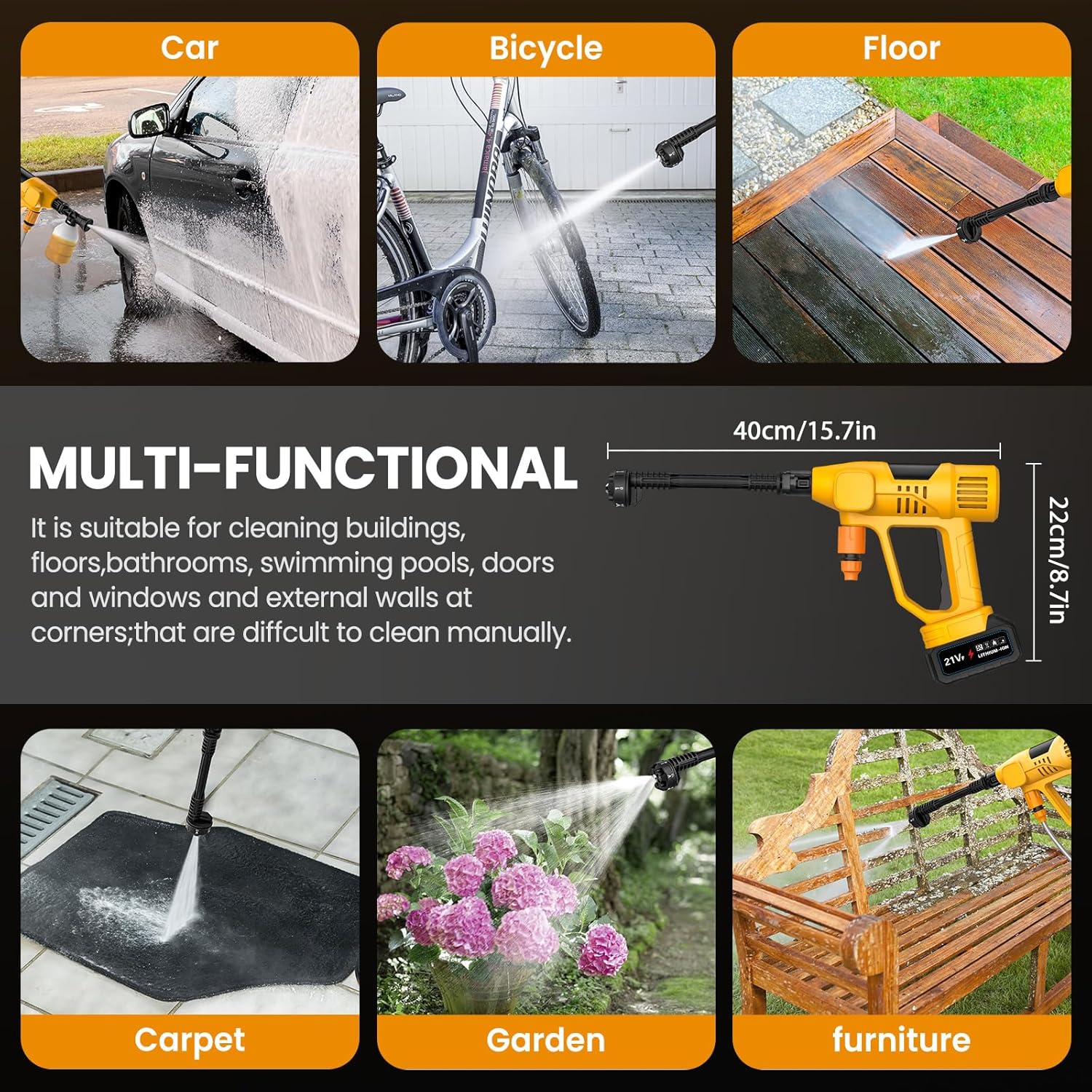 [Design sans Fil Portable] : Conçu pour être utilisé sans branchement électrique, ce pistolet haute pression sur batterie est facile à transporter et à manipuler, permettant de nettoyer les voitures, motos, vélos et mobilier extérieur où que vous soyez. Sa prise ergonomique et son poids bien équilibré assurent un confort maximal, idéal pour les longues sessions de lavage sans fatigue.