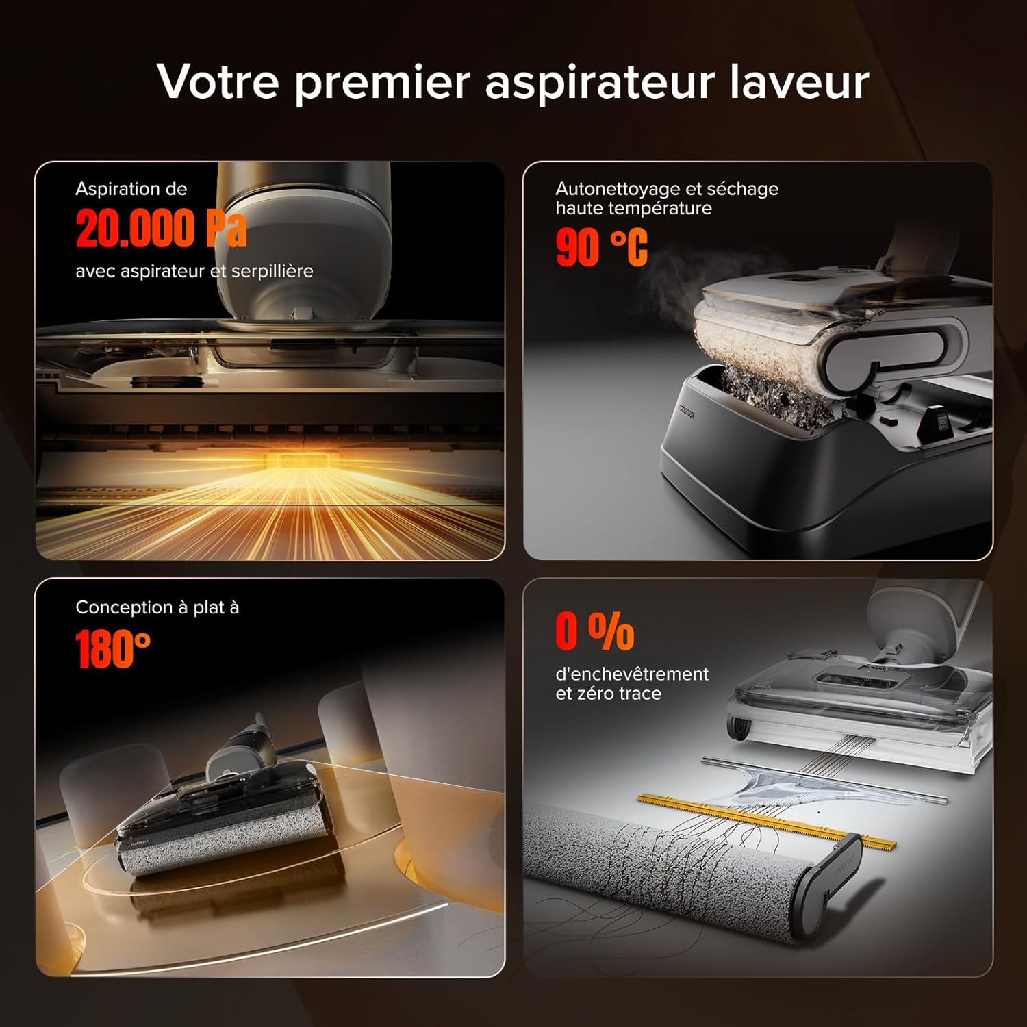 Nettoyage automatique à haute température (90 °C) et séchage à air chaud : laissez la machine s’occuper de la saleté ! La fonction de nettoyage automatique à haute température (90 °C) dissout la graisse et les saletés, tandis que le séchage à air chaud (90 °C) élimine les odeurs et l’humidité, pour un aspirateur tout-en-un toujours propre et prêt à l’emploi.