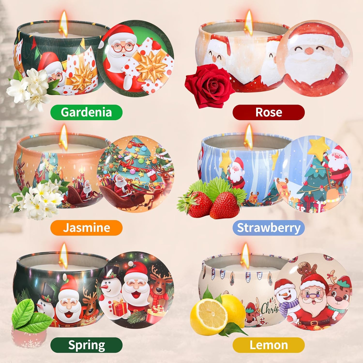 Set cadeau de bougies parfumées : le set de bougies de Noël contient 6 parfums : fraise, rose, gardénia, jasmin, citron, printemps, aide à soulager votre anxiété, votre stress et votre fatigue, et crée également une ambiance romantique et une atmosphère chaleureuse