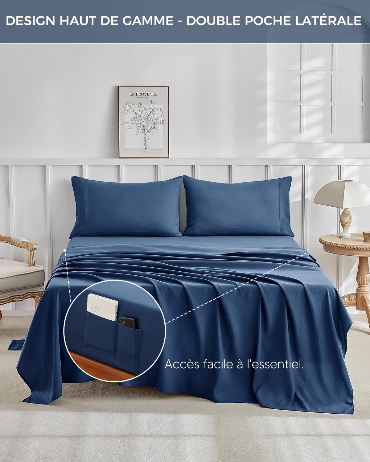 Design à poches double face – Gardez votre téléphone, votre télécommande ou vos essentiels à portée de main ! Ce drap housse est équipé de deux pratiques poches sur chaque côté, parfaites pour un accès rapide lors de la détente ou du sommeil. Restez organisé sans quitter le lit !
