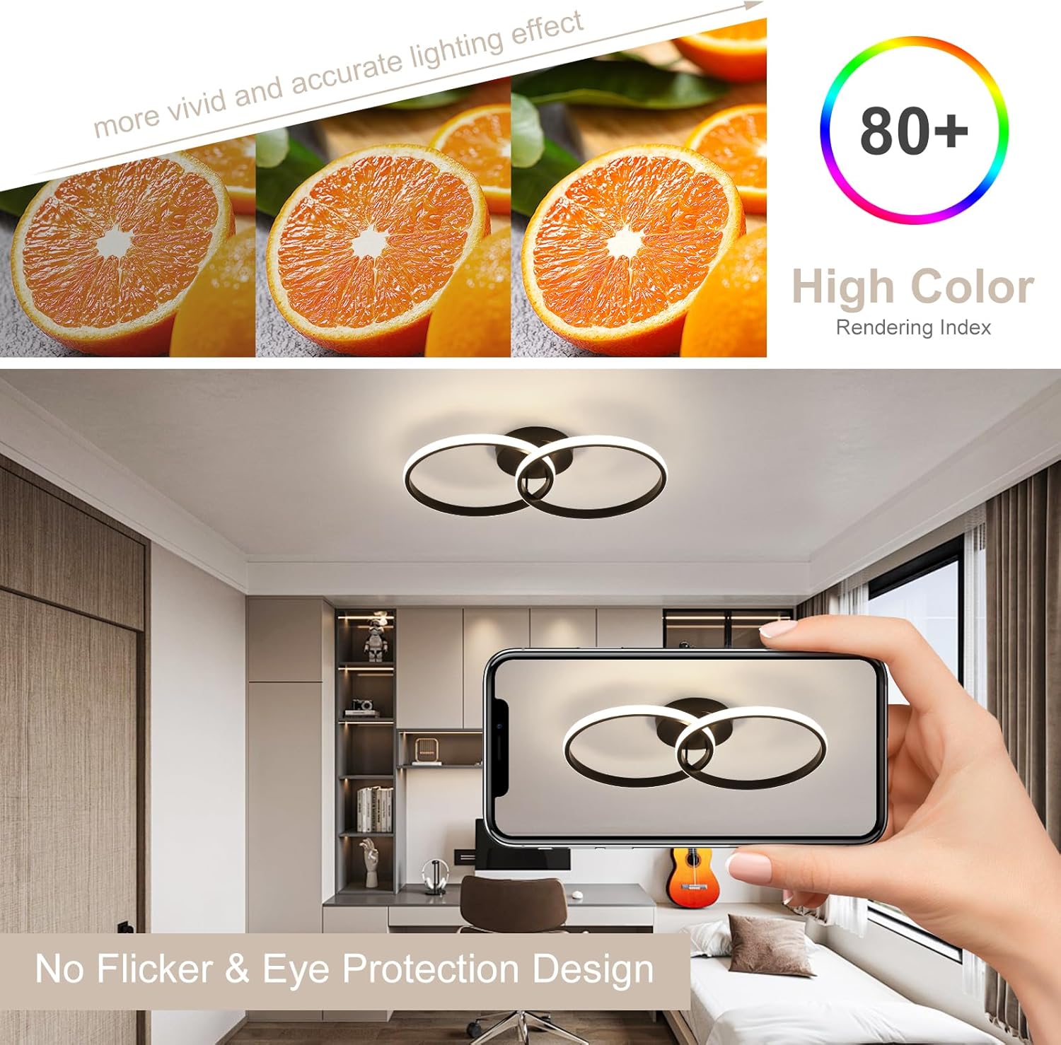 【Design géométrique】Le luminaire plafonnier LED adopte deux anneaux géométriques entrelacés pour créer un plafonnier de forme simple et élégante. Noir classique, correspondance des couleurs polyvalente. La lumière naturelle douce et le corps rond de la lampe remplissent votre chambre de couleurs à la mode et d’une atmosphère confortable.