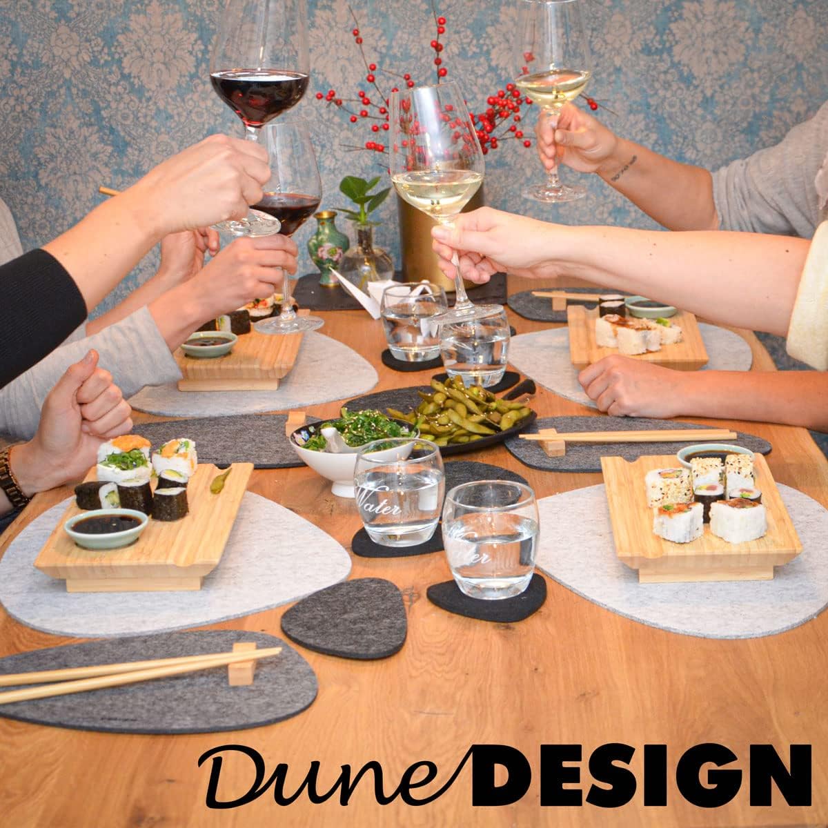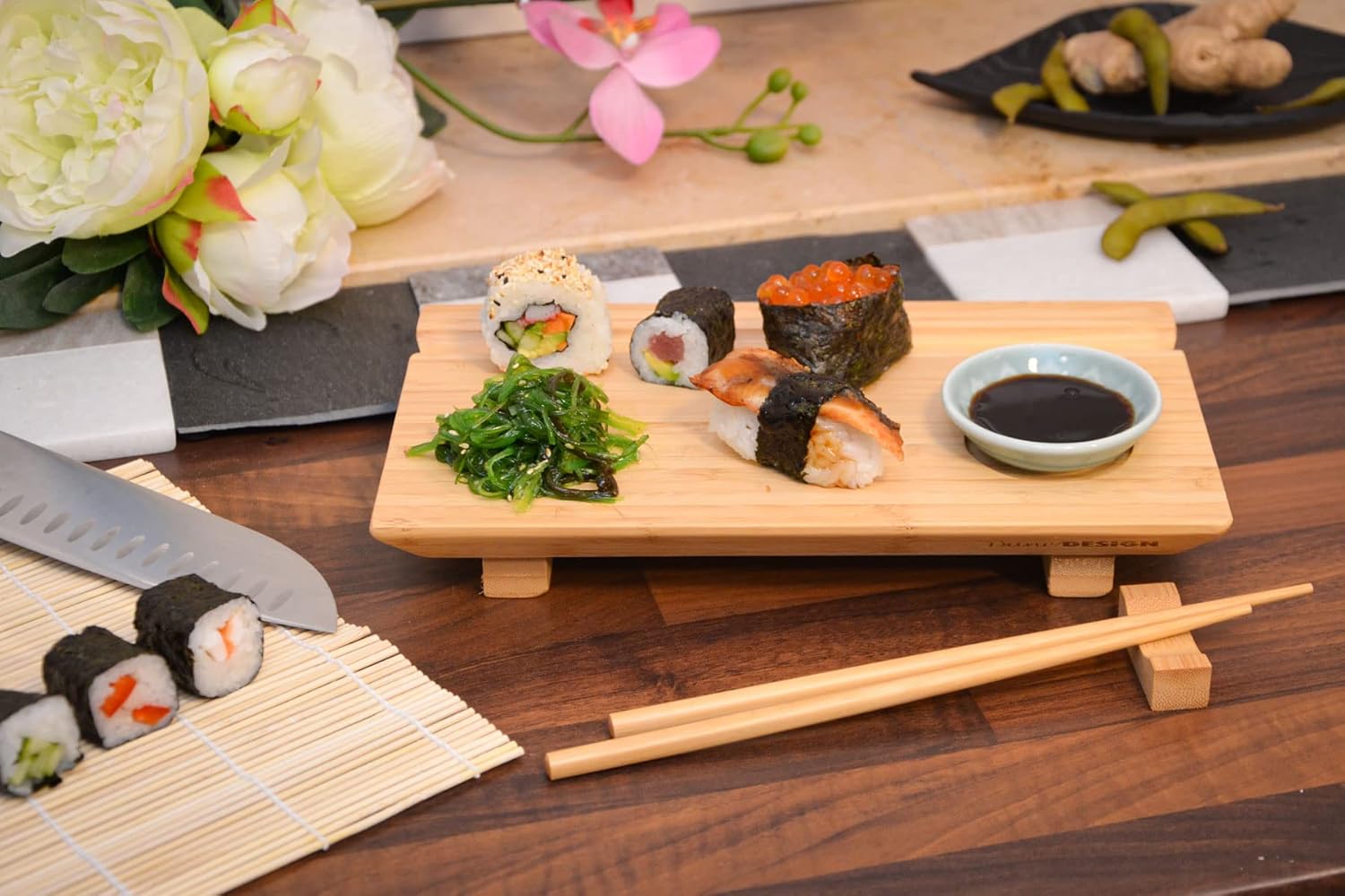 BOLS & BAGUETTES INCLUS – Service de style japonais : Planche avec des évidements sur mesure pour bols à sauce et baguettes. On peut poser des baguettes sur les bancs pour manger.