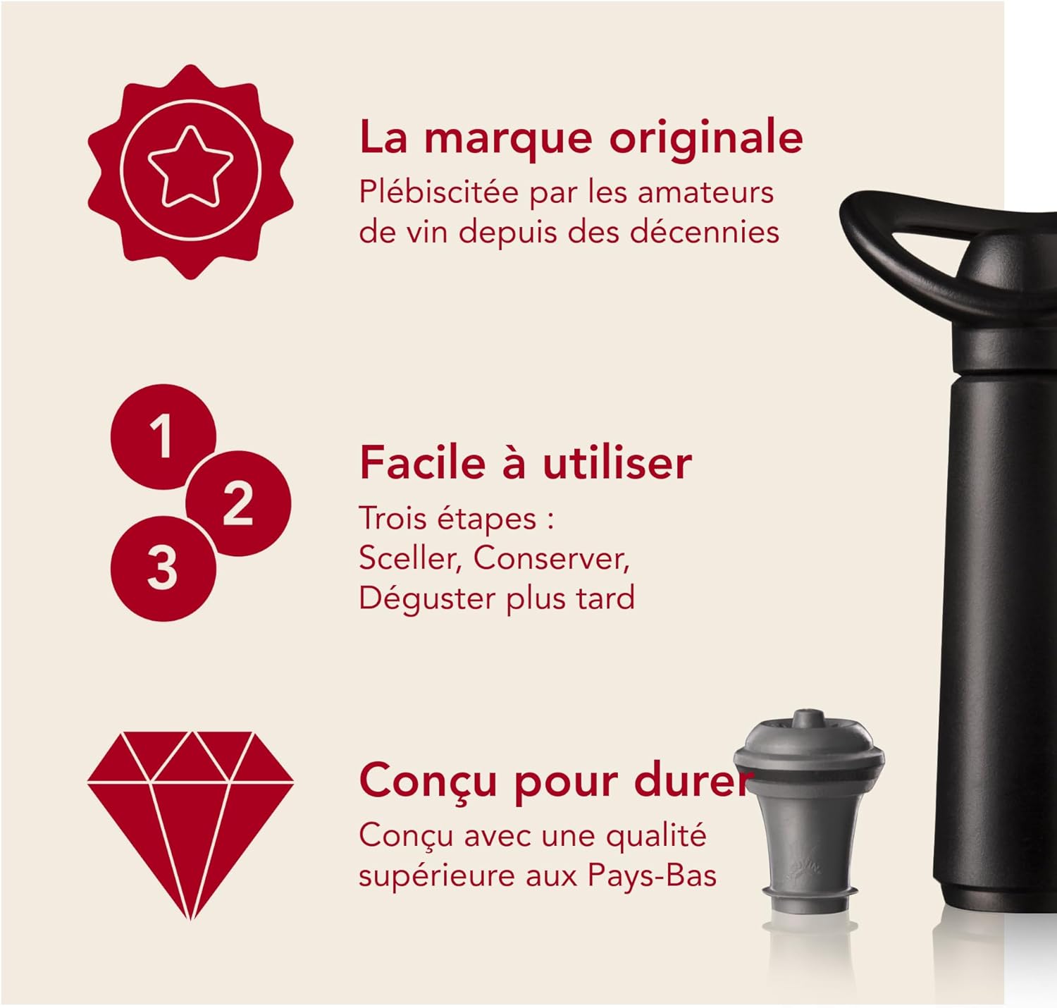 Conserve le vin jusqu’à 10 jours : Élimine l’air pour préserver l’arôme et le goût de vos vins ouverts.